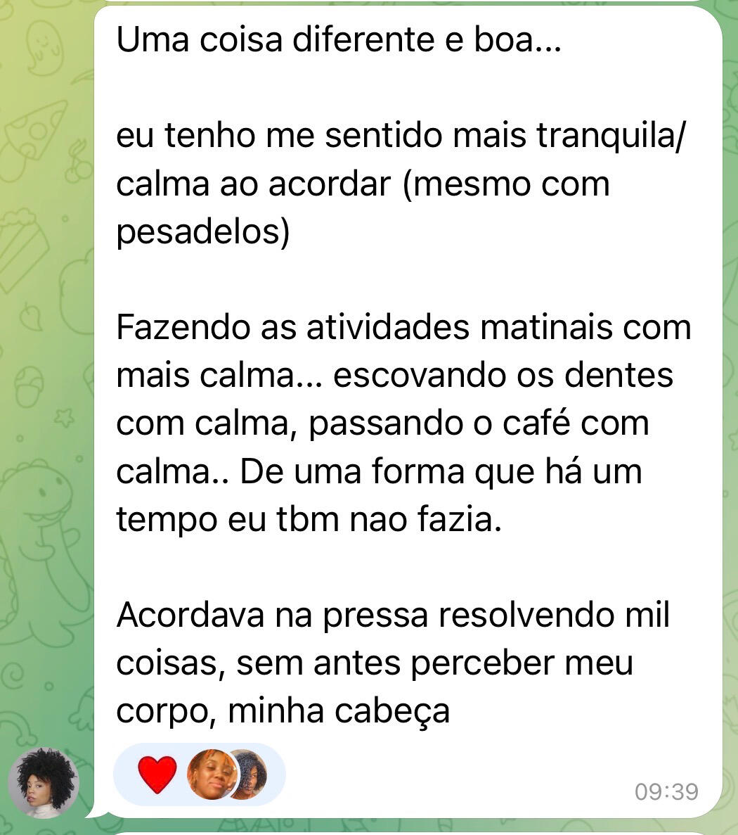 Difícil mensurar a grandiosidade dessa experiência, pois é verdadeira, profunda e é um espaço seguro para você cultivar seu novo eu, se expor com verdade e soltar tudo o que você guarda para você. Ao final da experiência você vai desejar não ter encerrado, assim como as 50 pessoas que já participaram e viram como através da reflexão, expressão e da meditação, conseguiram se ver com verdade depois de tanto tempo se perdendo nos enredos emocionais e nas ilusões criadas pela própria mente